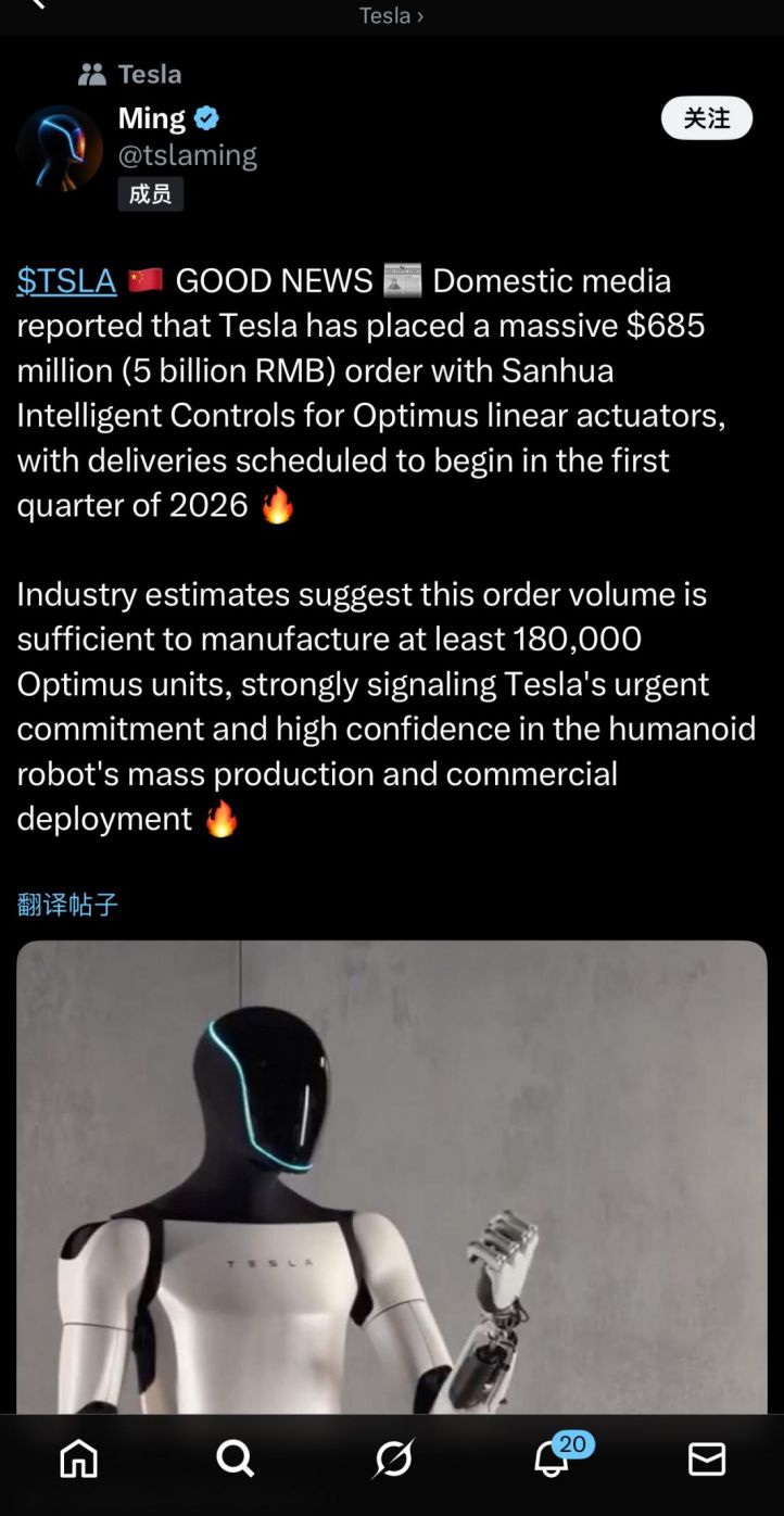 10月15日午间,市场传出消息称:特斯拉已向三花智控下达了价值6.85亿美元(约合50亿元人民币)的Optimus线性执行器订单,计划于2026年第一季度开始交付。业内估算,该订单量足以生产至少18万台Optimus机器人。