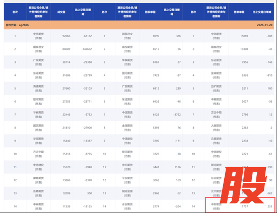 根据沪银期货此前的数据来看,在1月20日,中财期货(代客)仅出现AG2606合约的持仓排名表中,彼时持有空单1757手。