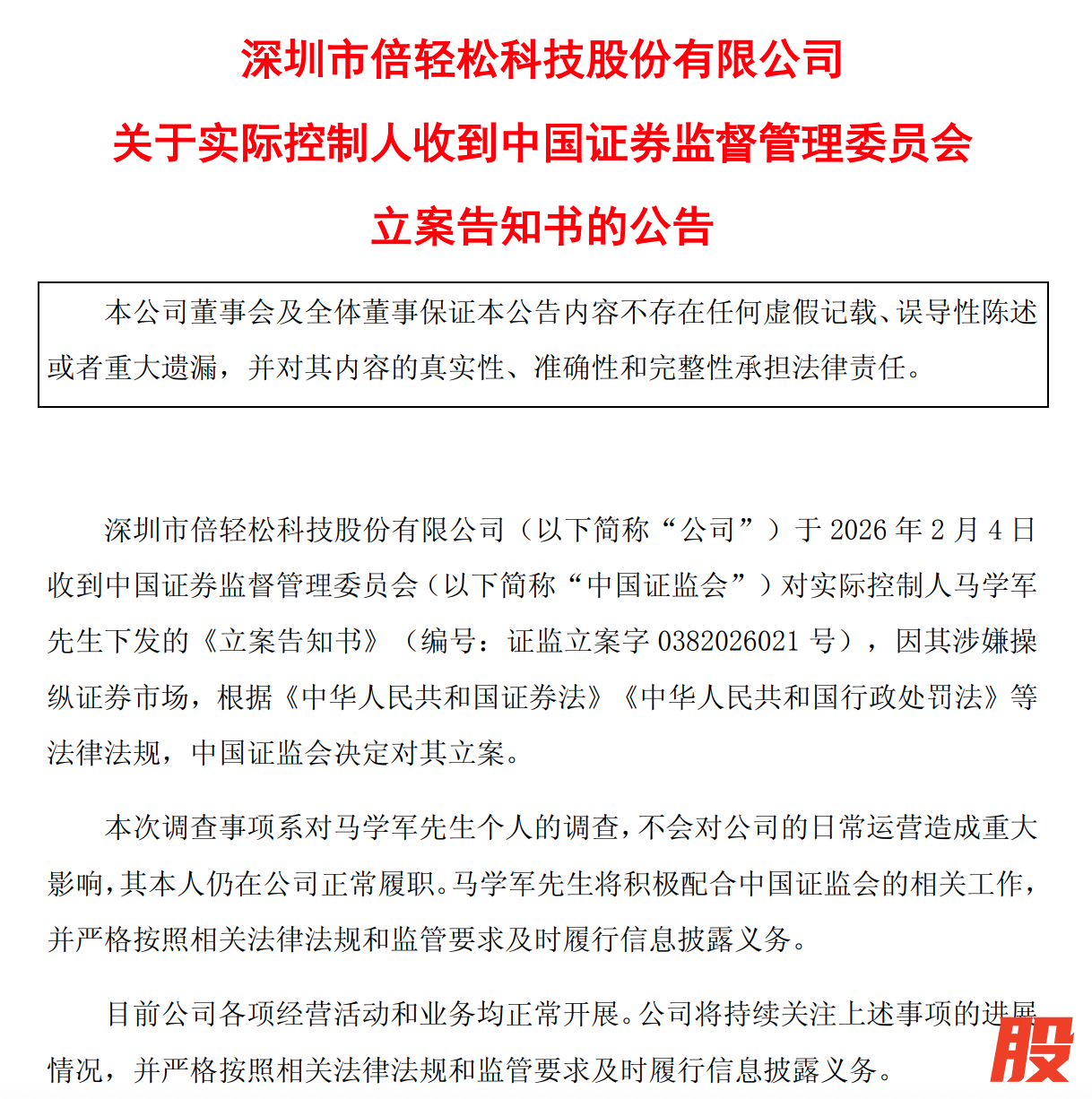 仅在一个多月前的2025年12月25日晚,倍轻松便已发布公告称,公司于12月25日收到中国证监会下发的《立案告知书》,因公司及实际控制人马学军涉嫌信息披露违法违规,根据相关法律法规,中国证监会决定对公司及实际控制人马学军立案。